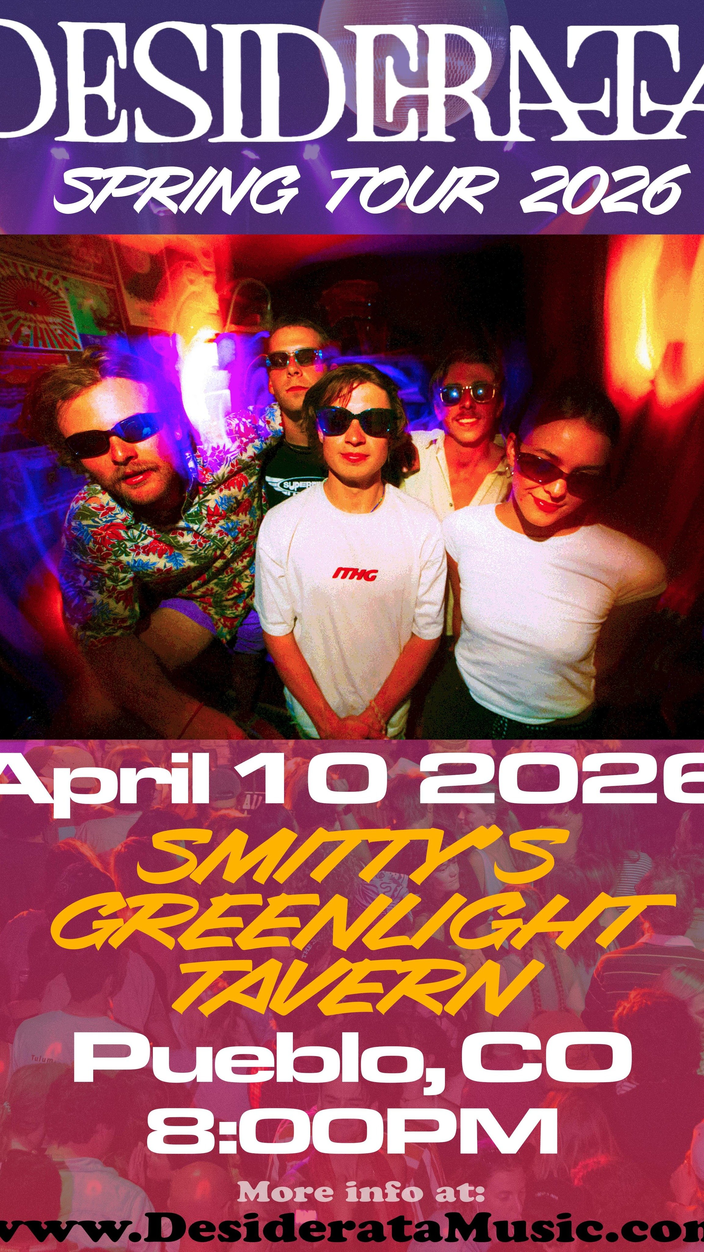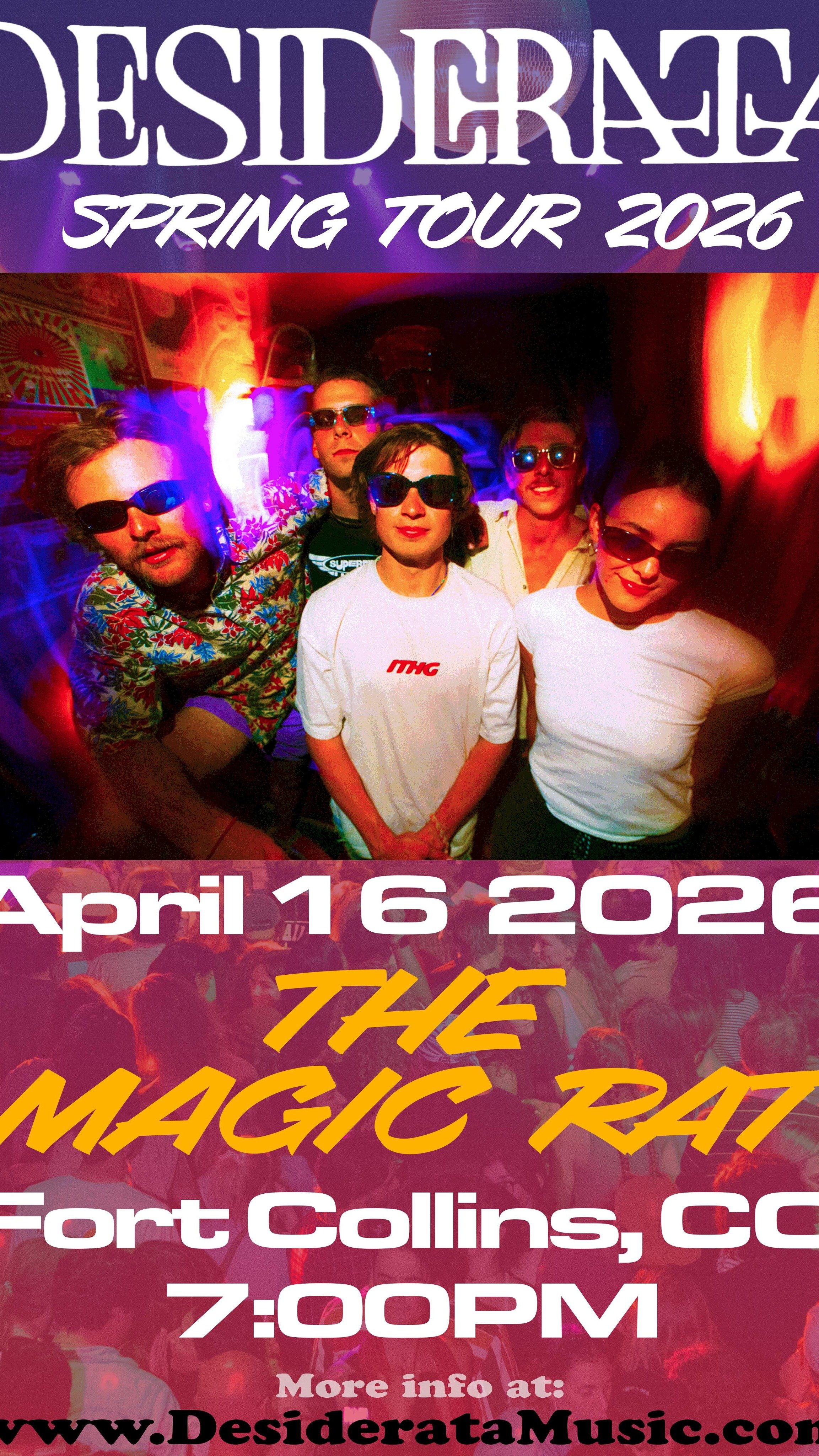 A five-piece band based in Fort Collins, Colorado, originally formed in Durango. Their sound blends tight, danceable grooves with timeless melodies—think Fleetwood Mac meets modern funk. The band features Autumn Ford on silky pop vocals, Connor “Minky” Klimenko on bass, Hamo Thorneycroft on lead guitar, Jake Ostrowski on keys, and Will Roberts on drums. Inspired by desert sunsets, mountain views, close friendships, and neon-lit dance floors, Desiderata mixes Soul, Pop, Funk, Indie, Disco, and Rock into a vibrant, feel-good sound.